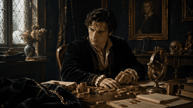 Renaissance scene of a noble poet standing by a candlelit window while a distant beloved appears faint in the shadows, symbolizing fragile trust and hidden doubt in Shakespeare’s Sonnet 92.